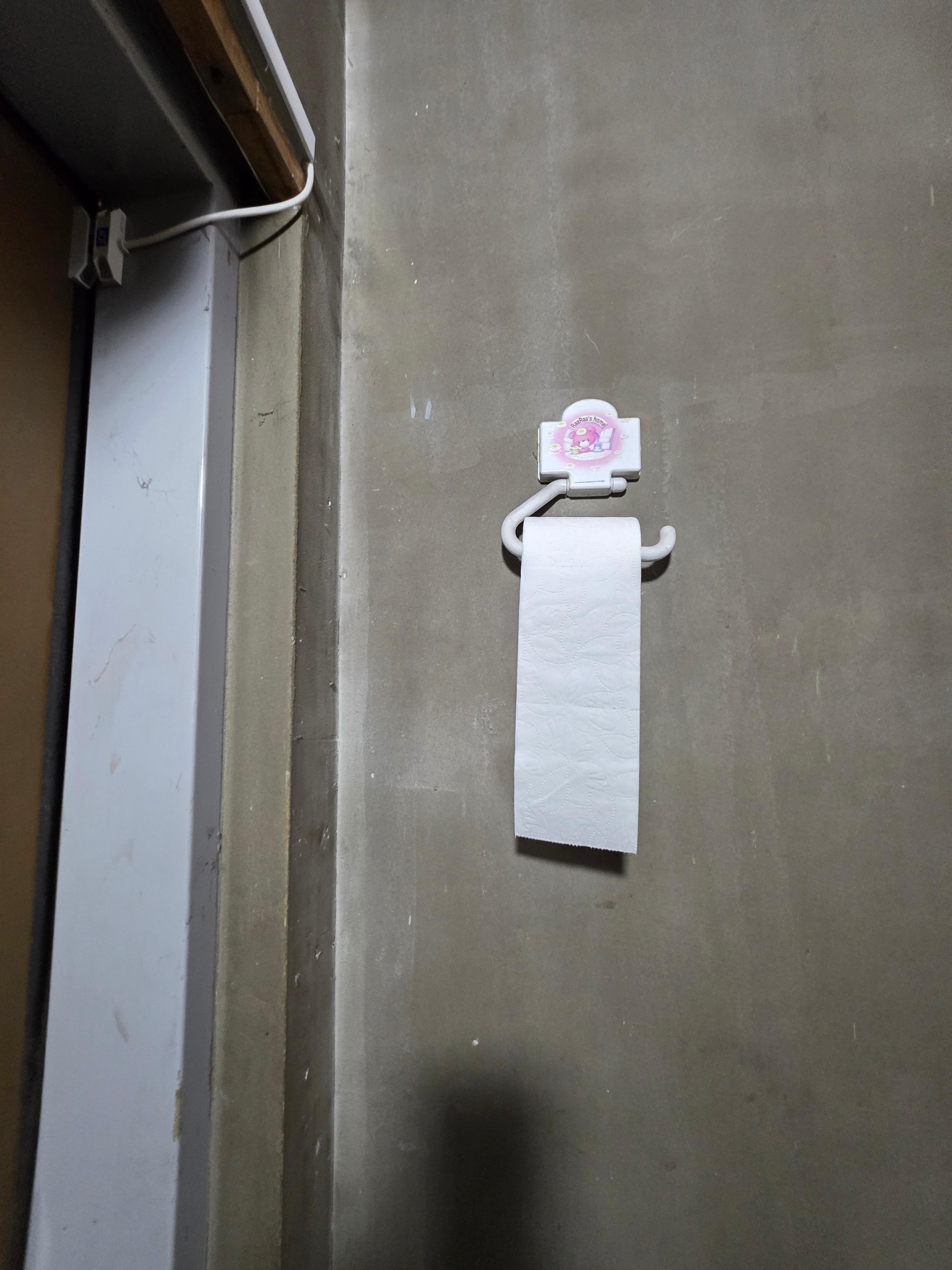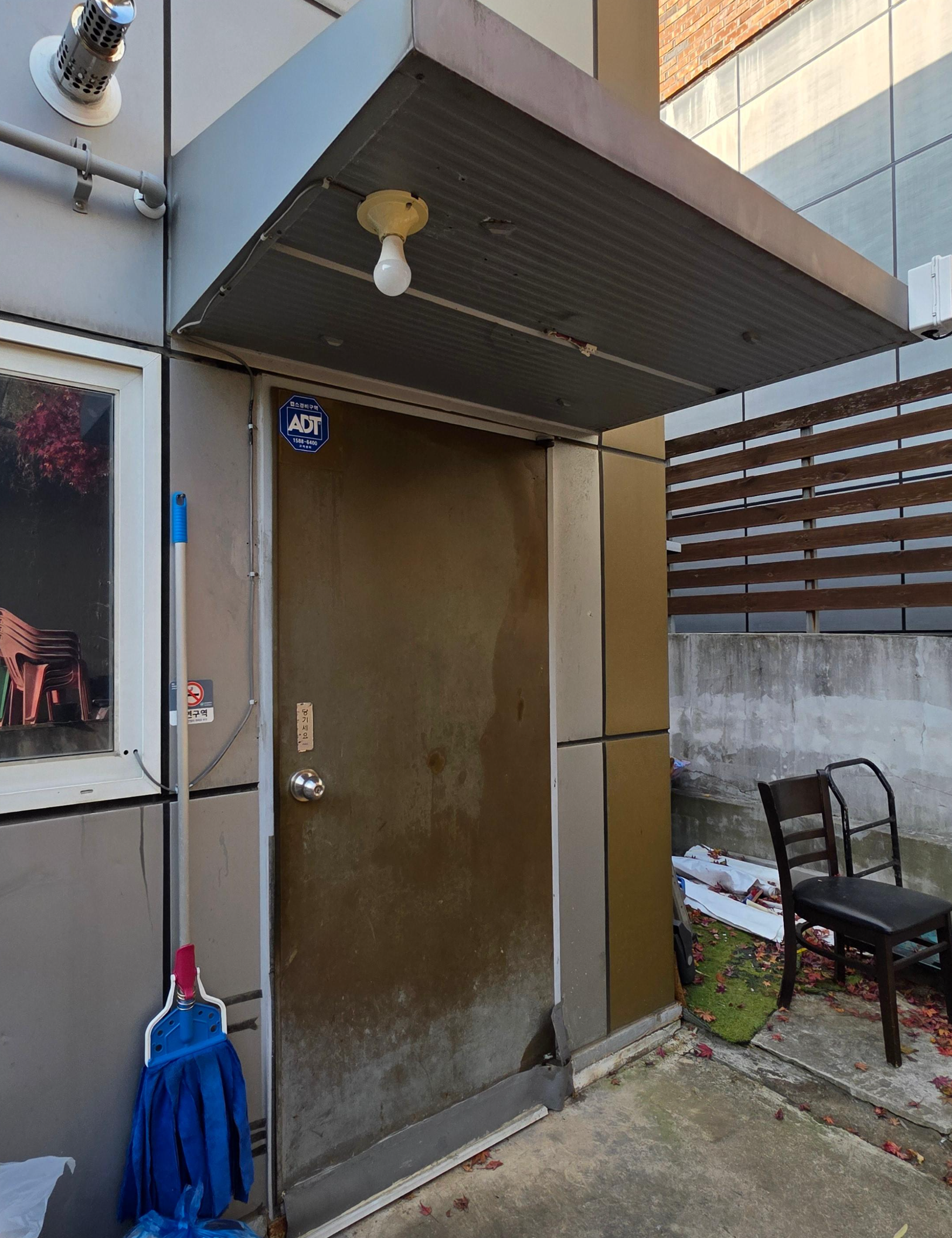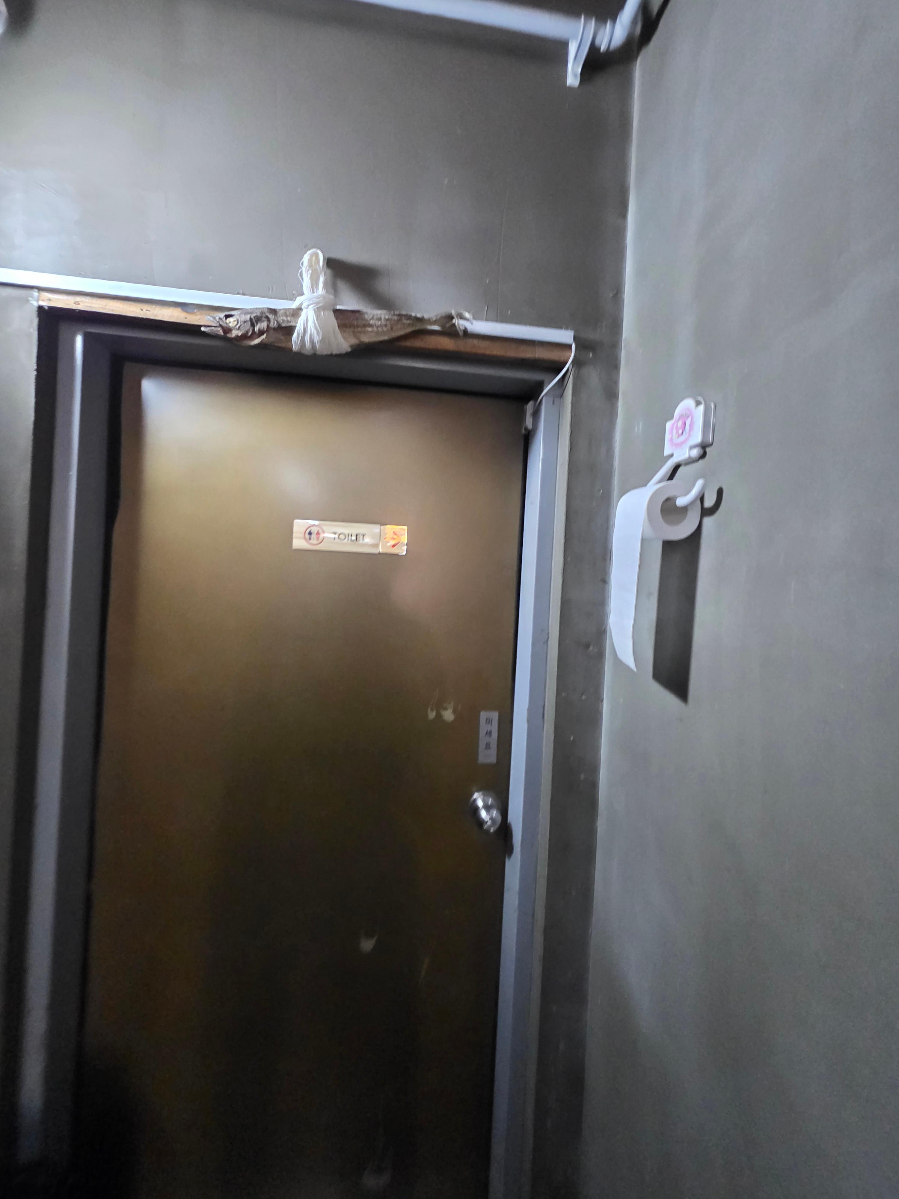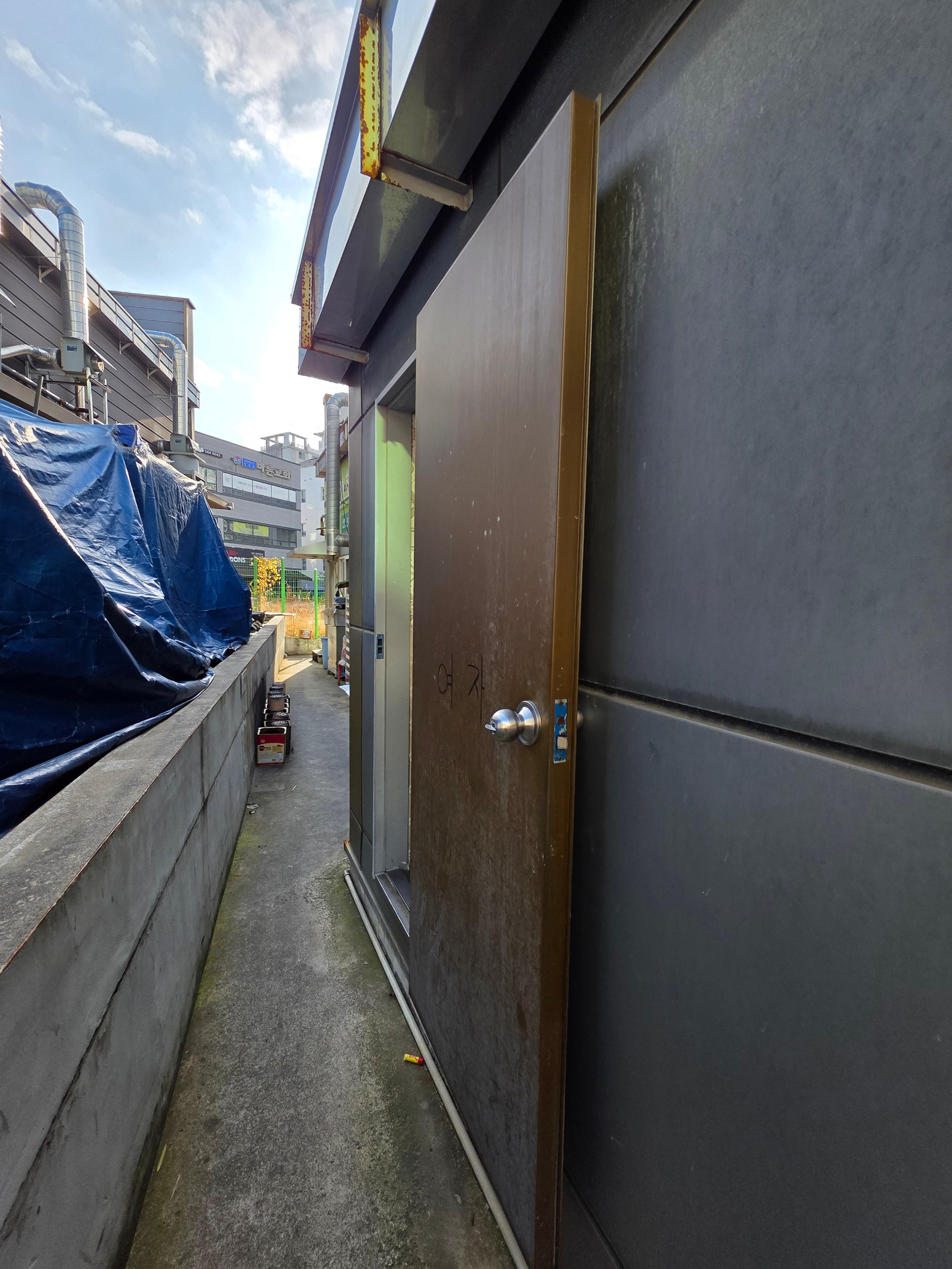 화장실 가는 길, 문에 화장실 푯말이 붙어있다. 옆에는 화장지가 걸려있고, 철문을 열고 나가면 밖으로 나가는 곳