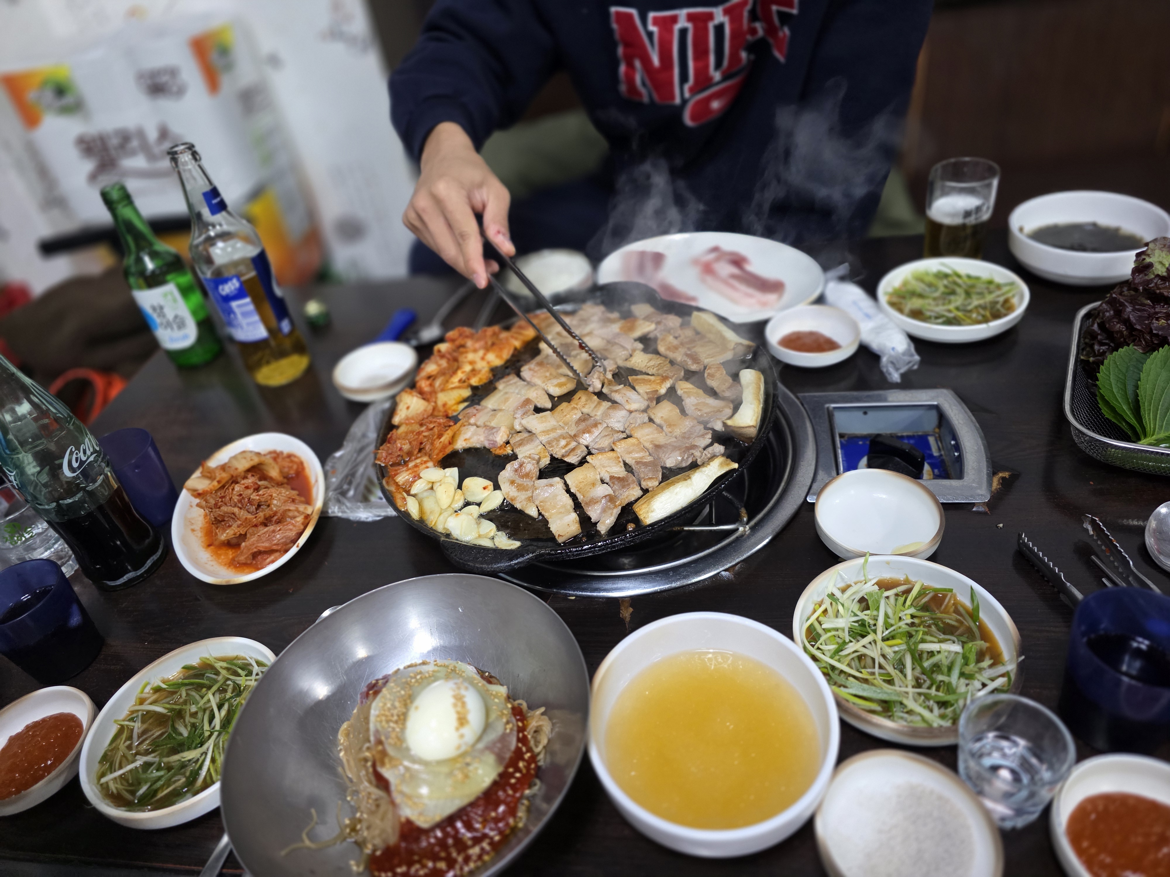 그렇게 집에 가면서 뭘 먹을까 서로 노래를 부르다 결정한 삼겹살