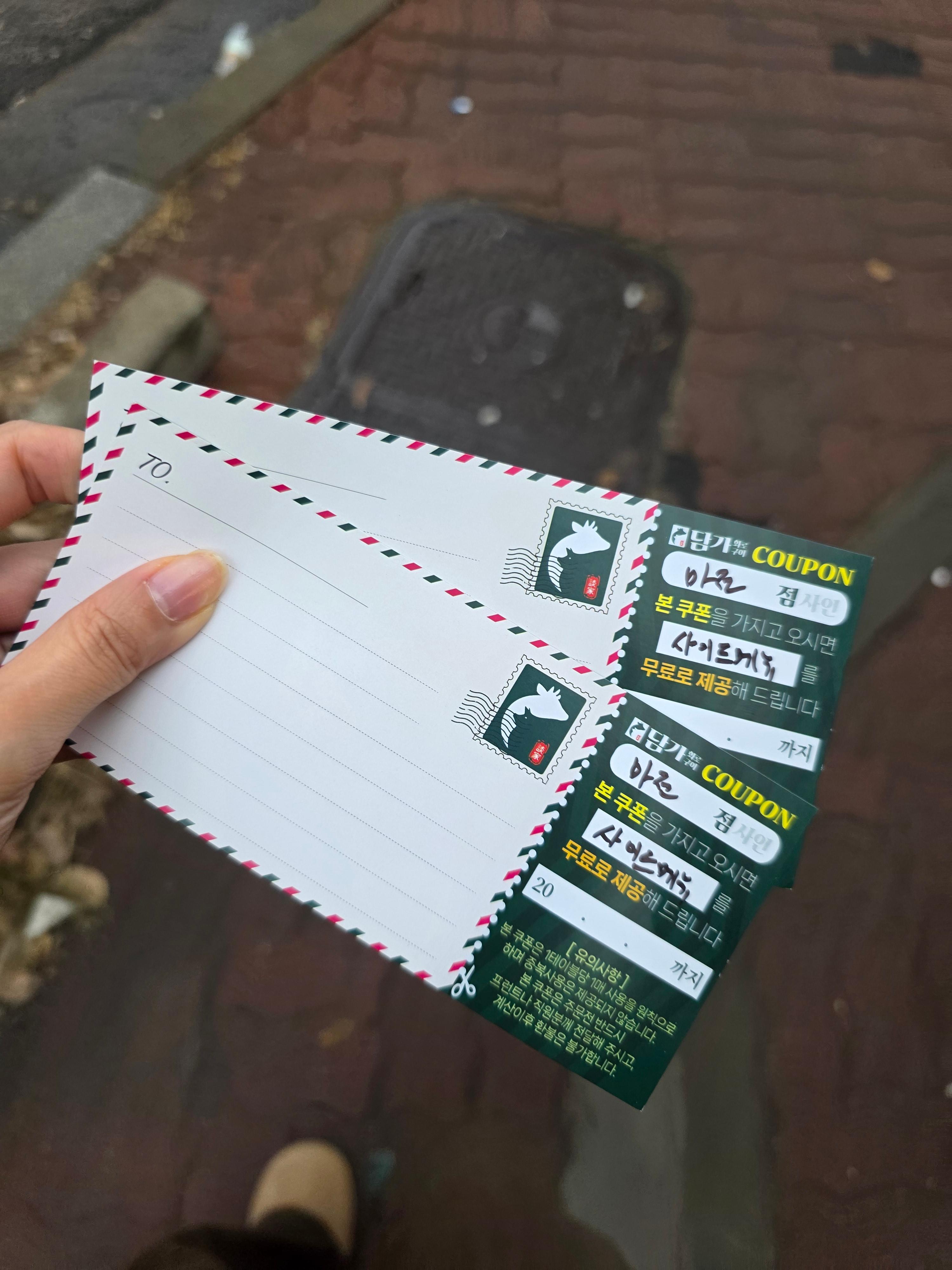 그래서 결국 언제 쓸 지 모르는 사이드메뉴 쿠폰만 두 장이 되었다. 그전에 받았던 된장찌개 무료쿠폰까지 모두 세 장...