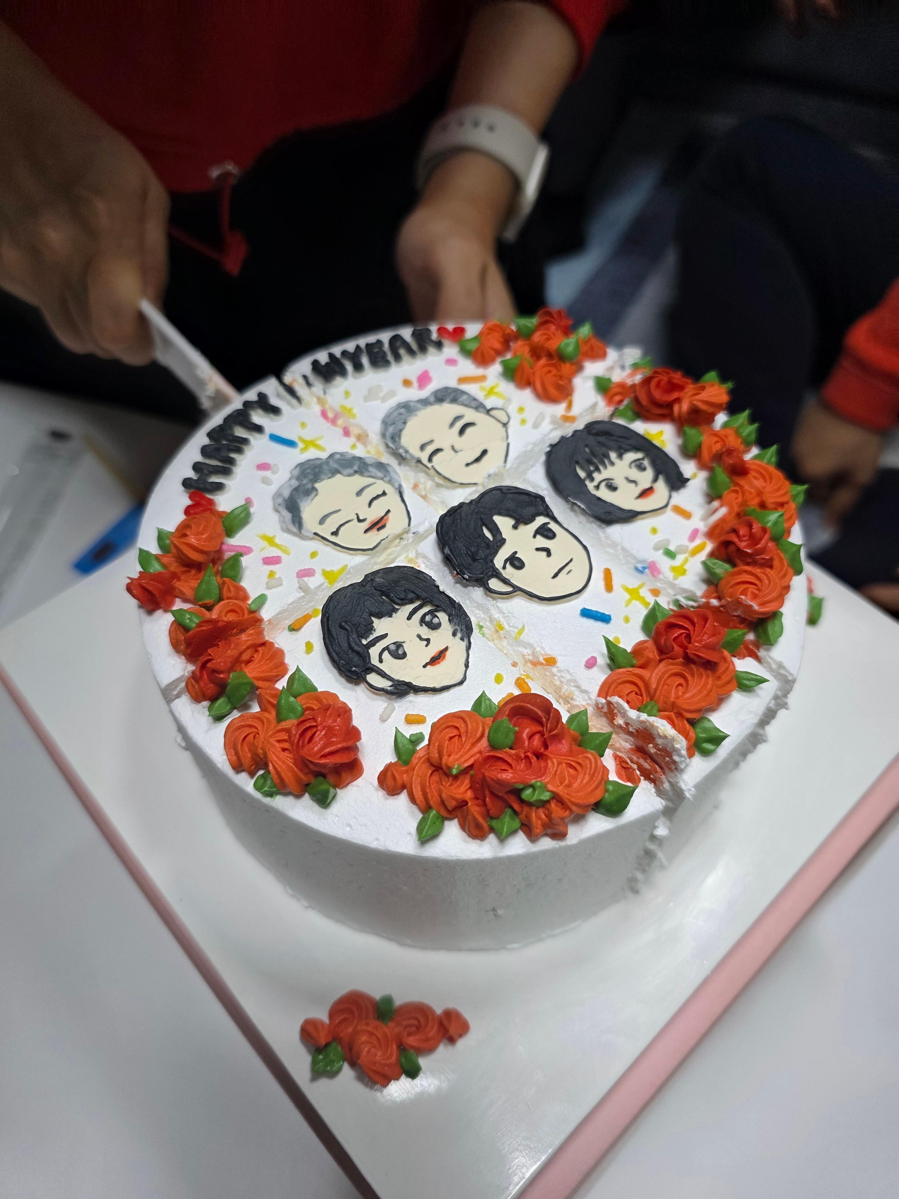 우리 가족을 그려준 케이크인데 아빠 머리 대머리인데 그렇게 그리기가 좀 그래서 머리카락을 그려줬다고 했다.