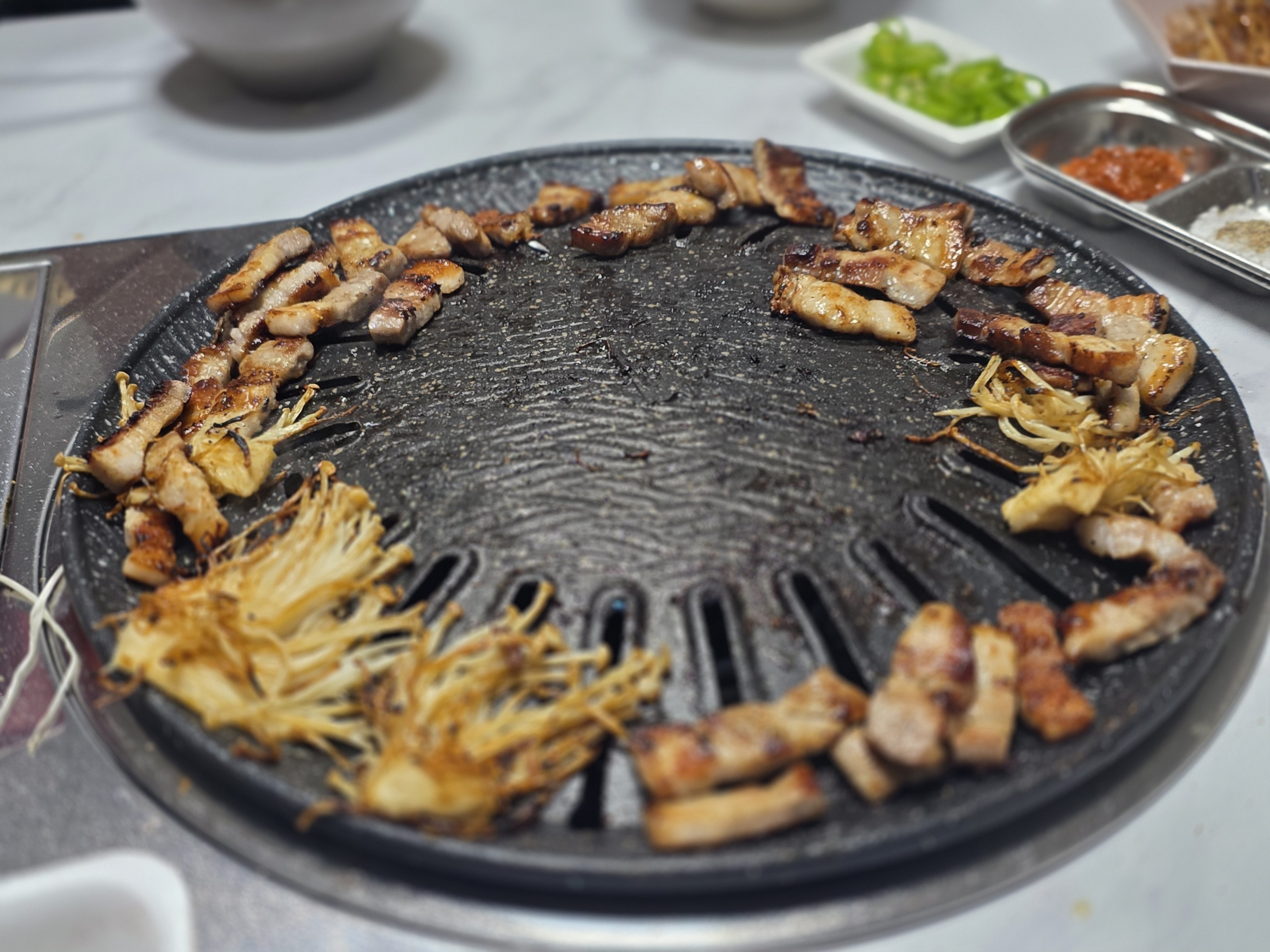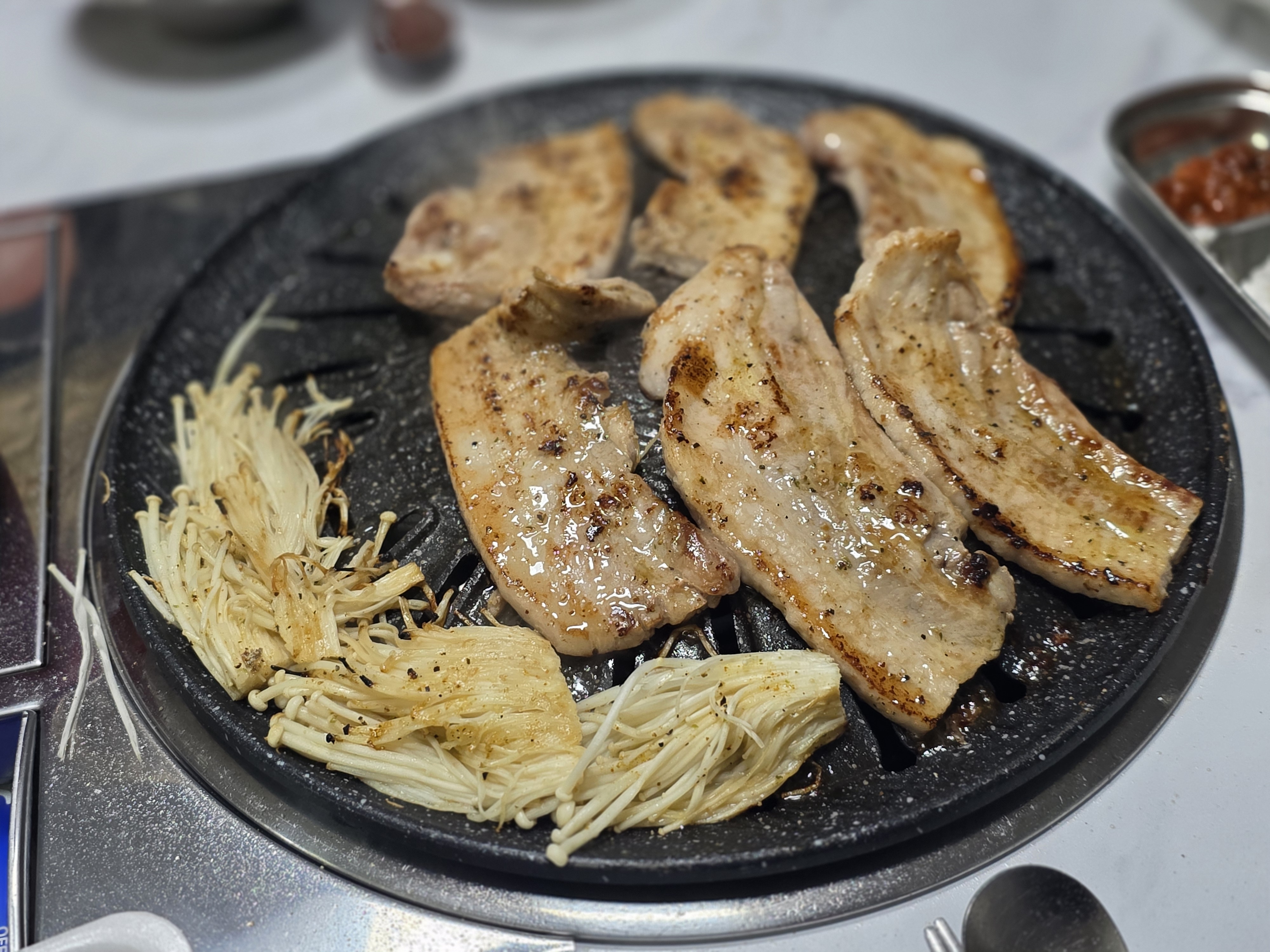 고기불판등장! 삼겹살 빠삭하게 굽고 팽이버섯도 빠삭하게 굽고!