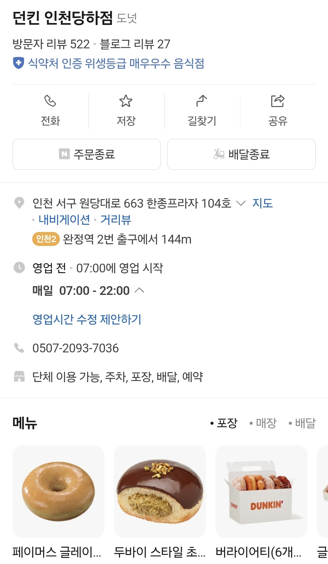 던킨도너츠 인천당하점 영업시간 07:00-22:00