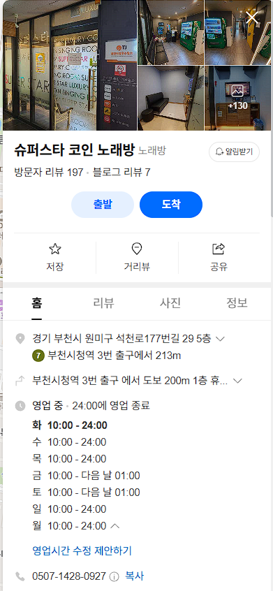 슈퍼스타 코인 노래방 부천점 영업시간 10:00-24:00, 금토는 10:00-01:00