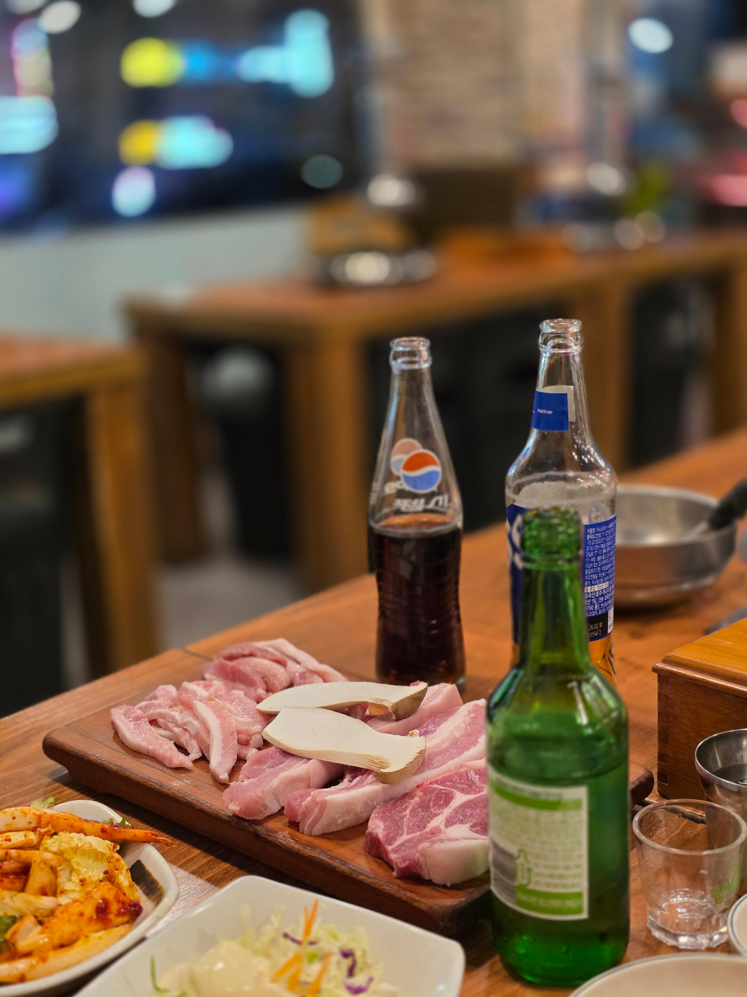 오늘은 배가 많이 고파서 어떤걸 먹을까 하다가, 고기에 소주도 땡기니까 소주도 한 잔 하기로 했다.