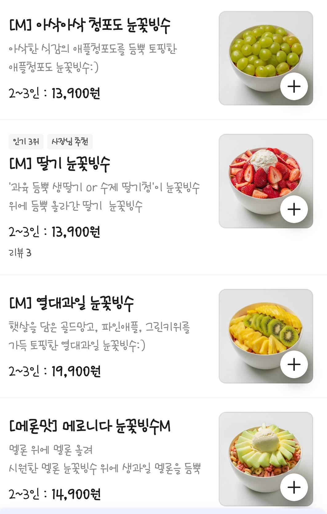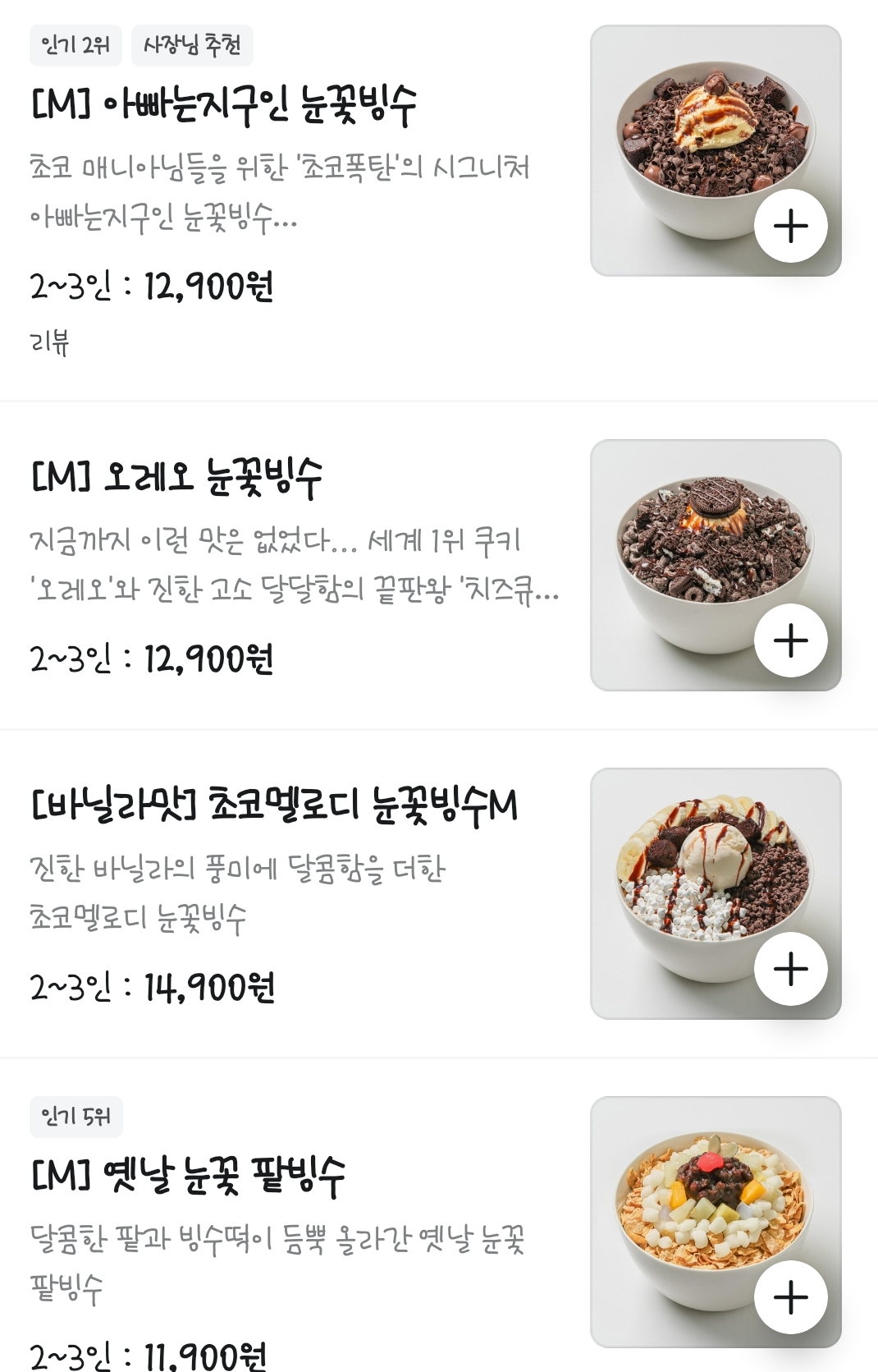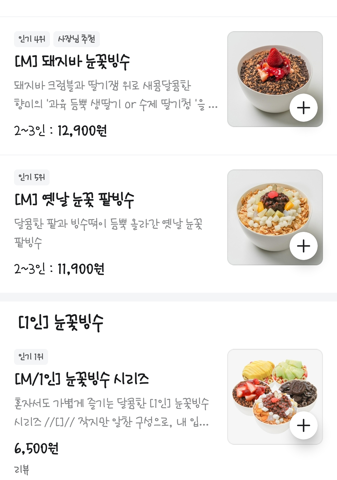 우리가 시킨 메뉴는 나는 아빠는 지구인 눈꽃빙수, 엉아는 옛날 눈꽃 팥빙수, 동생은 생골드망고 눈꽃빙수. 세가지 모두 1인 눈꽃빙수로 구매!