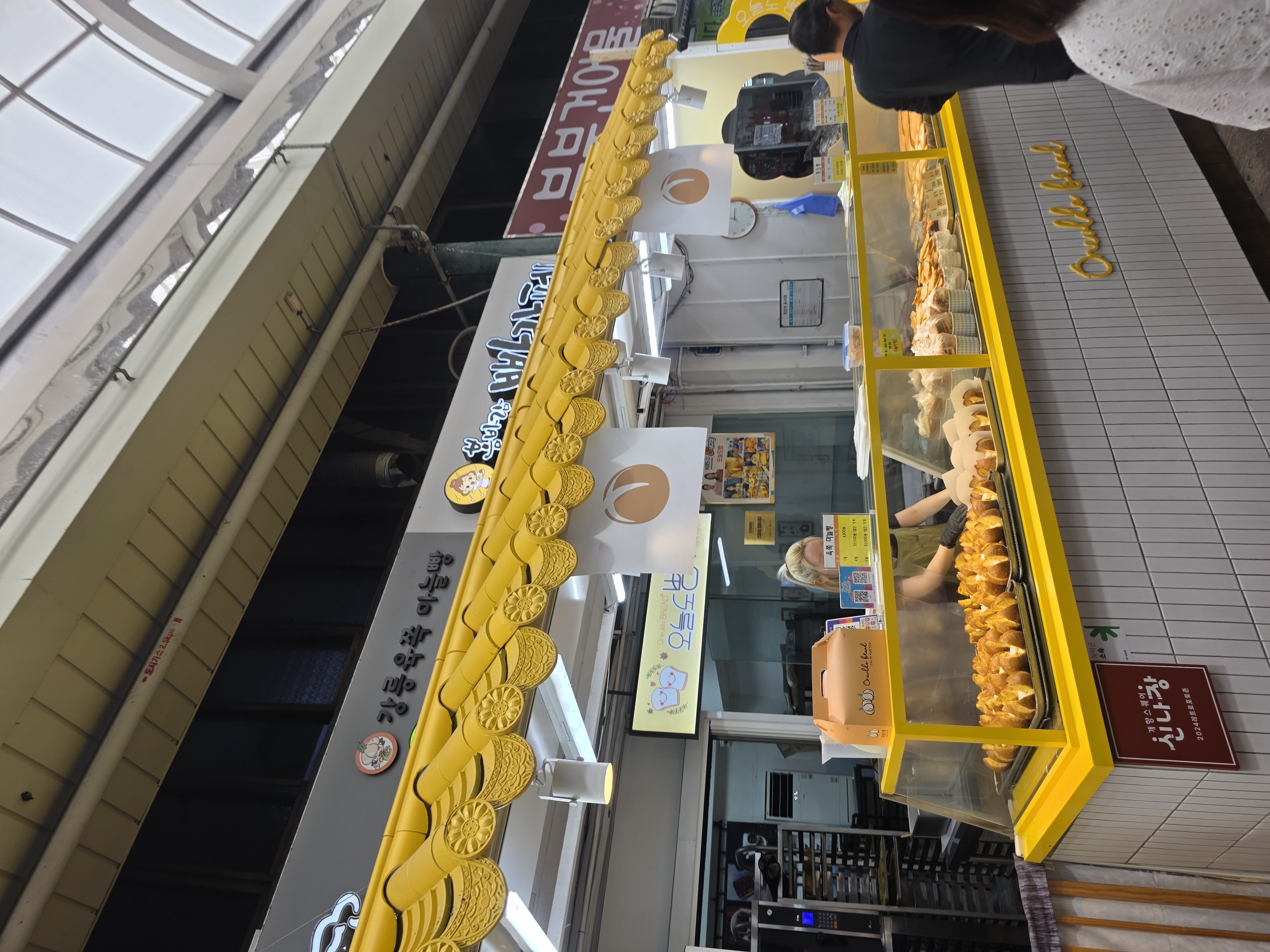 공갈빵, 만두, 분식, 꽈배기, 육즙마늘빵, 문어빵 등 다양한 음식이 잔뜩