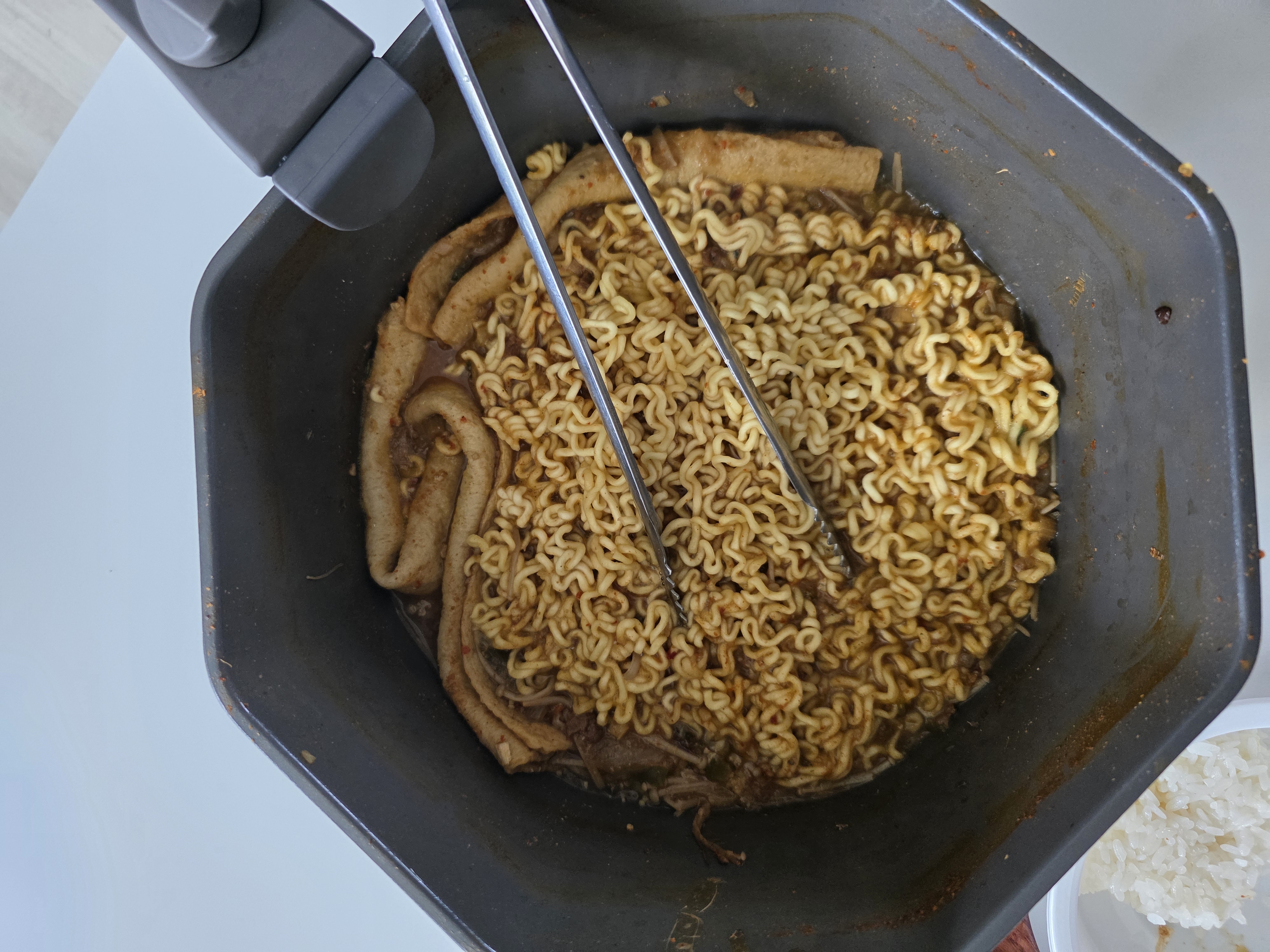남은 꽃게탕 국물에 라면2개와 어묵을 넣고 점심으로 먹었다.