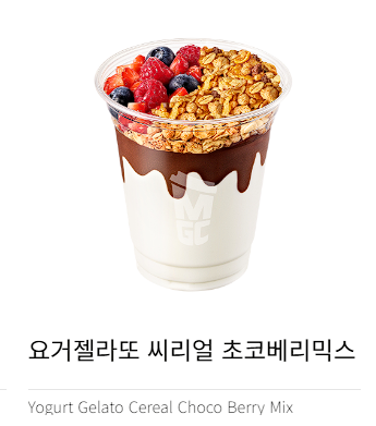 맨 위에는 씨리얼, 중간에 베리믹스와 젤라또, 맨 아래에 초코시럽이 깔려있다.